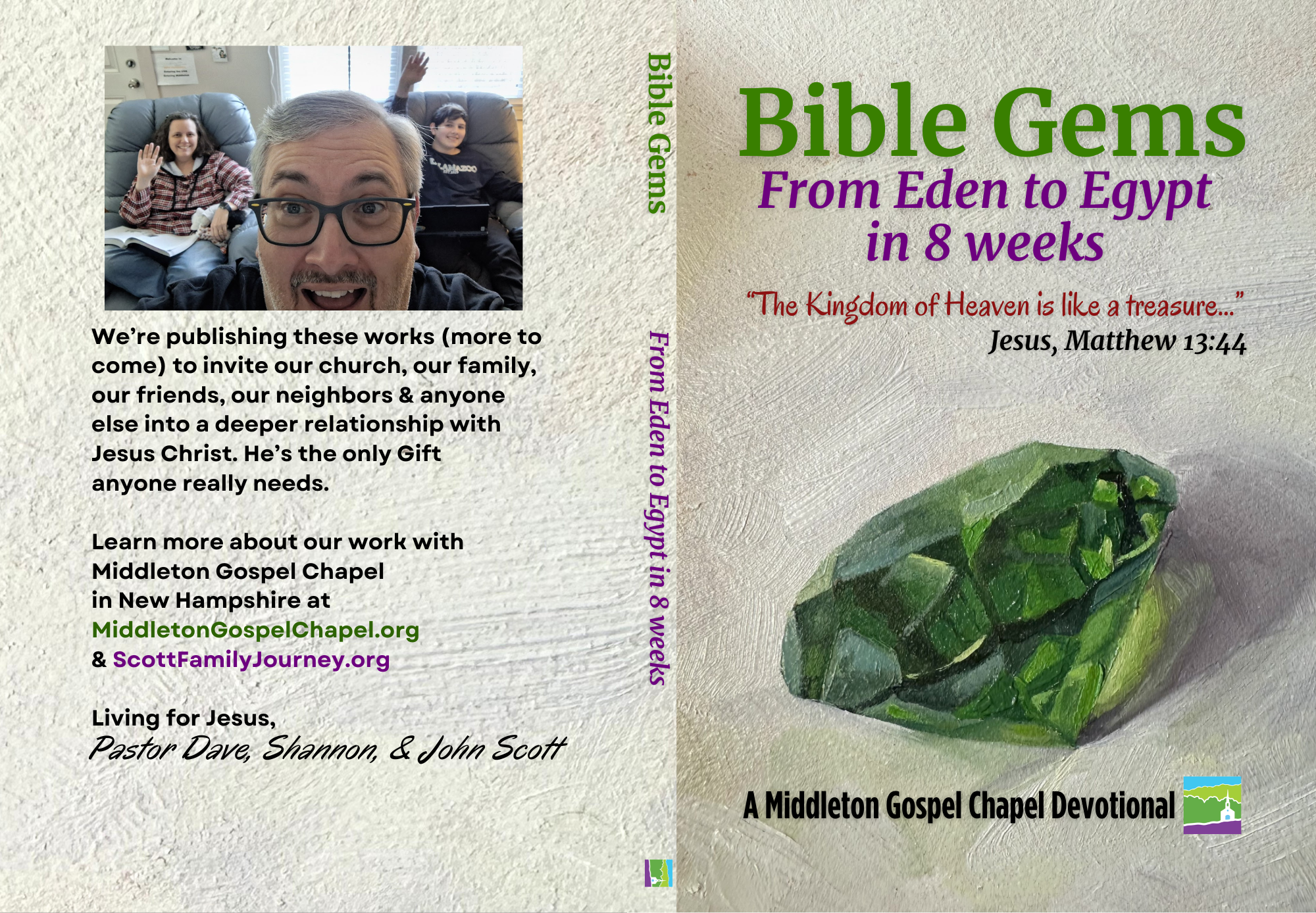 The BIBLE GEMS book pictured below is the 1st of 3 planned devotional studies that showcase how the Gospel reveals Jesus as the Creator of Genesis, Jesus as the Risen Savior worshipped by us—the New Testament Church, & Jesus as the Judge of Revelation 14:6-7. We insert the church invitation cards in the books we give out & it’s not just the Scott family, either, but also our church family at Middleton Gospel Chapel in New Hampshire, all freely giving these away as Jesus describes in Matthew 10:8—inviting the receiver into a deeper friendship with Jesus & us. These books aren’t for sale. We only give them away!